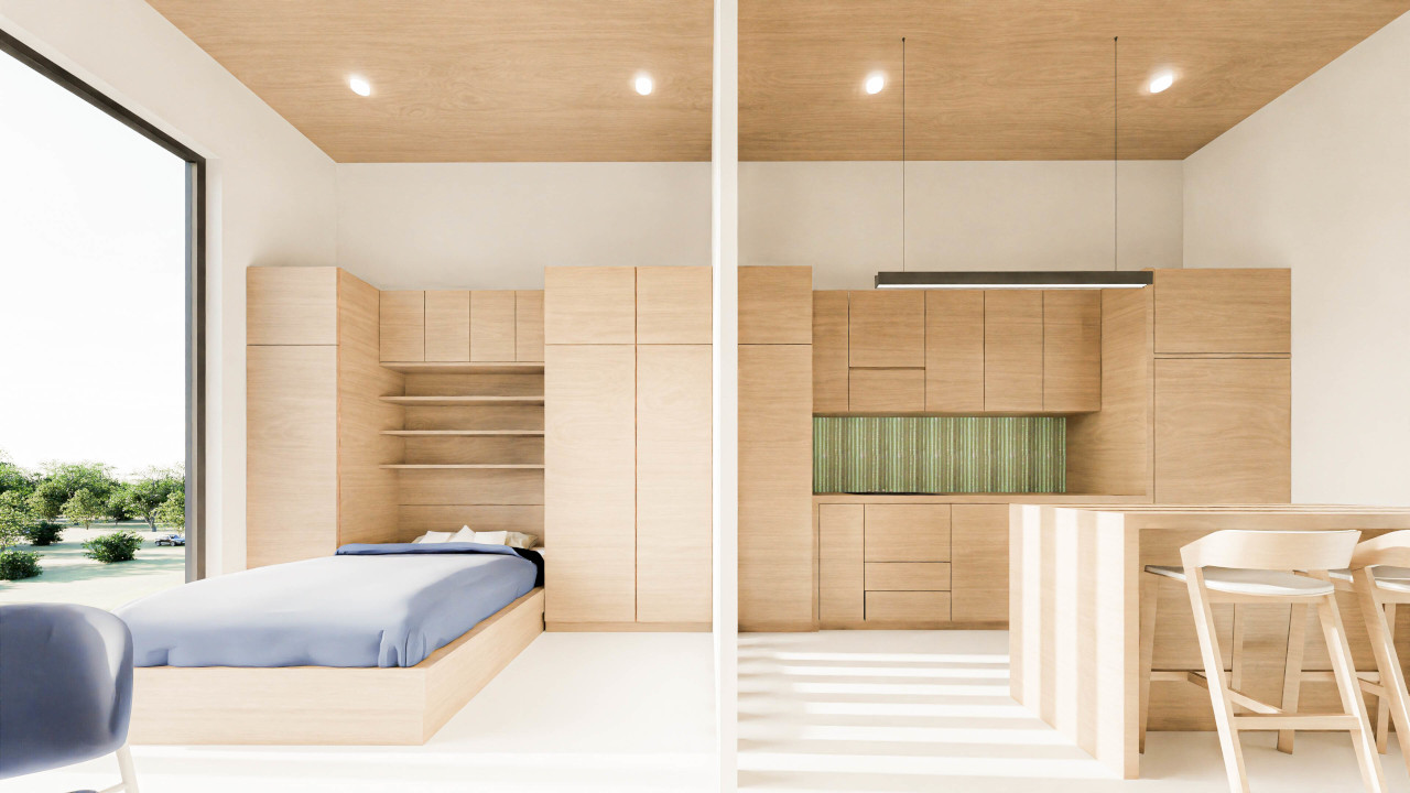 The articulated façade of the upper levels with concave and convex shapes are set on top of walls with a rammed earth finish that rises to form the circulation core. The resulting architecture is an outward expression of the building’s programme.