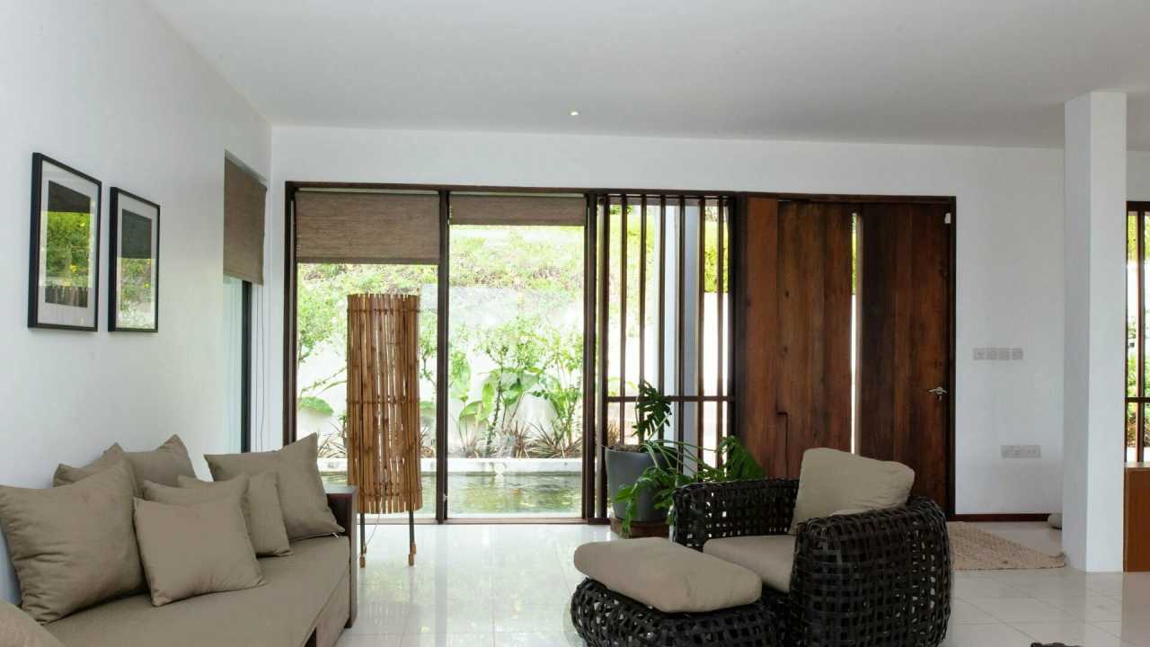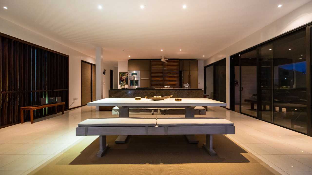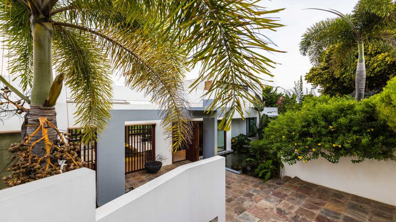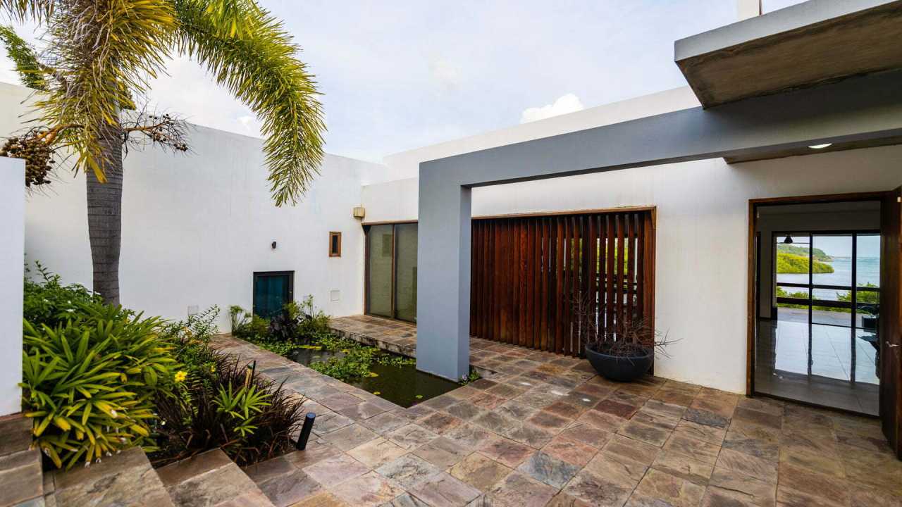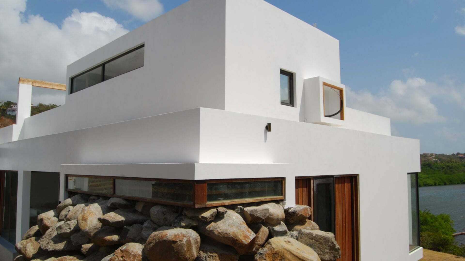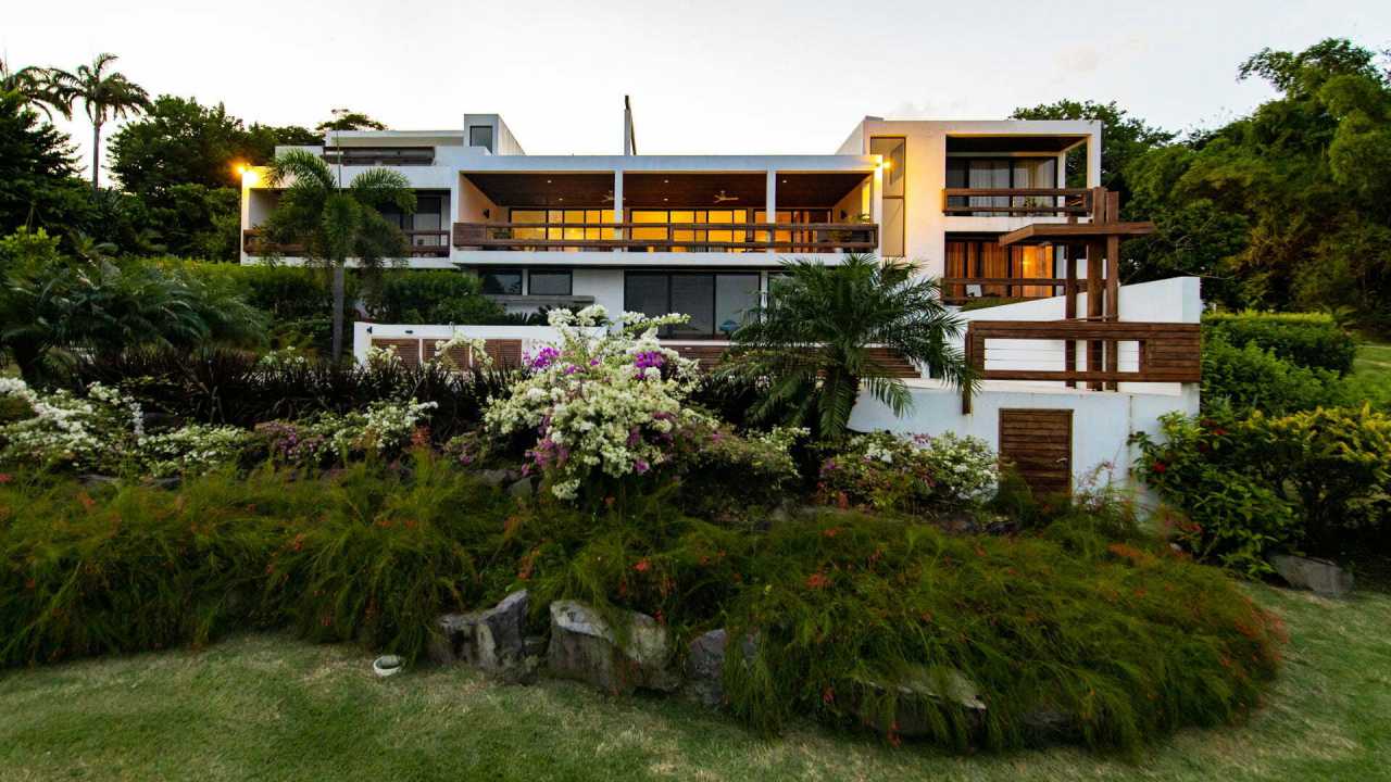The interior of the house offers spectacular views of Westerhall Bay which is immediately revealed through sliding glass doors connecting the open-plan living space to the verandah, while bedrooms flank either side of the building. A rooftop terrace as well as an office complete the composition. The material palette was restrained, comprising a mixture of natural stone (delete comma) and hardwoods against a backdrop of whitewashed walls.