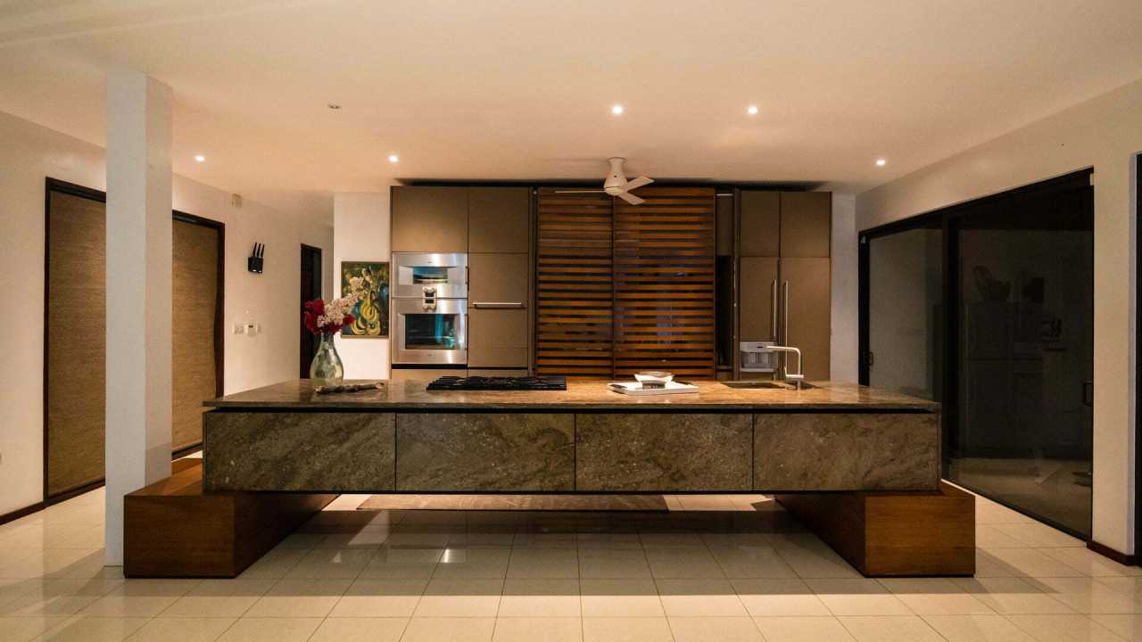 What started as a simple renovation turned into a ‘new build’ after structural defects were discovered in the existing building. From the foliage of the lush tropical landscaping a new split-level contemporary dwelling emerged. Barely visible from the road, a slate covered entry courtyard contains two reflecting ponds.