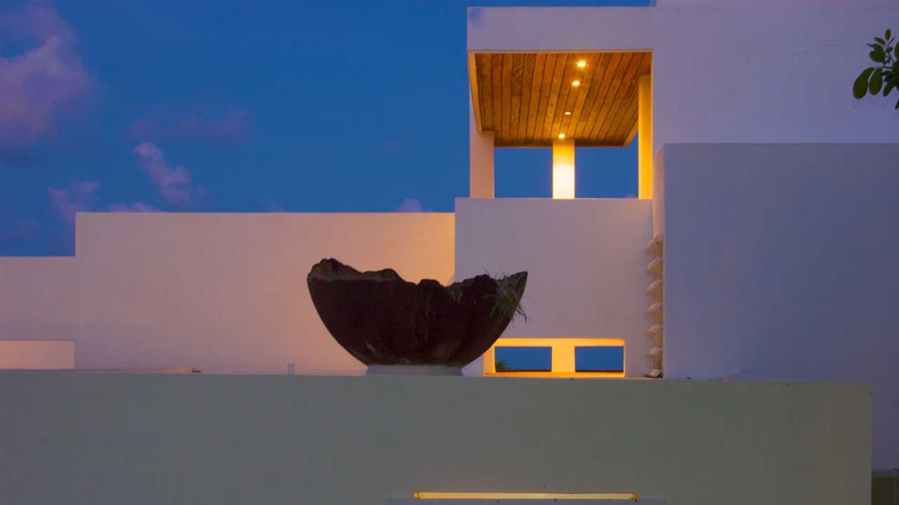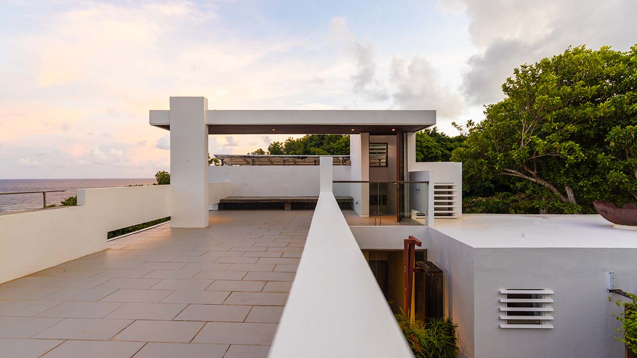 A double skin consisting of operable vertical timber louvers and large sliding glass doors provided the optimum solution to the site’s challenges of wind control and horizontal rain. Seamless transition between the exterior and interior occurs through a courtyard placed in a shielded location. Low sculptural walls maintain visibility to the ocean while providing necessary protection from the wind to a sundeck at the rooftop, enhanced by built-in concrete benches.
