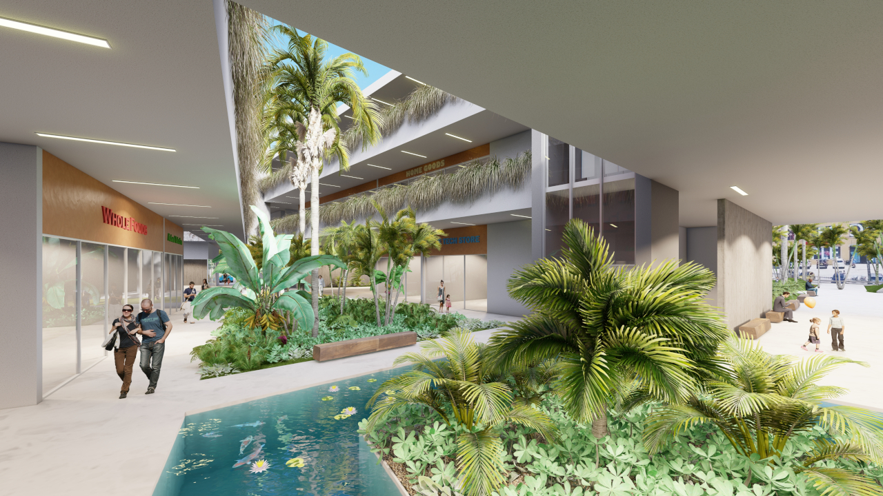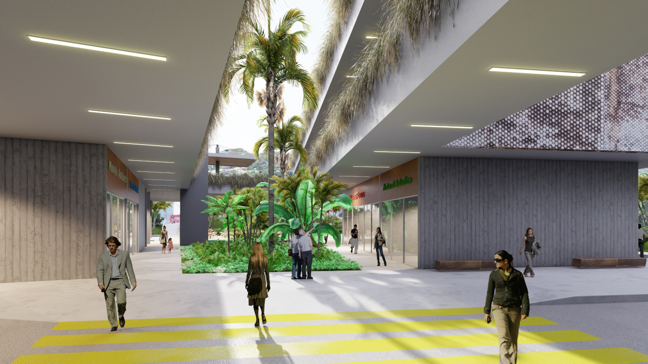 Green zones can reduce the temperature of cities by 2-3 degrees, creating more comfortable living environments for the future. Oasis is a green zone design concept that reinterprets the space of the shopping mall for ‘social shopping’. A park-like tropical setting of free-flowing, open-air commercial offerings, augmented by lush foliage and ponds, provides a more humanizing and sustainable model for community engagement – replacing the insular, hermetic mall spaces of the past.