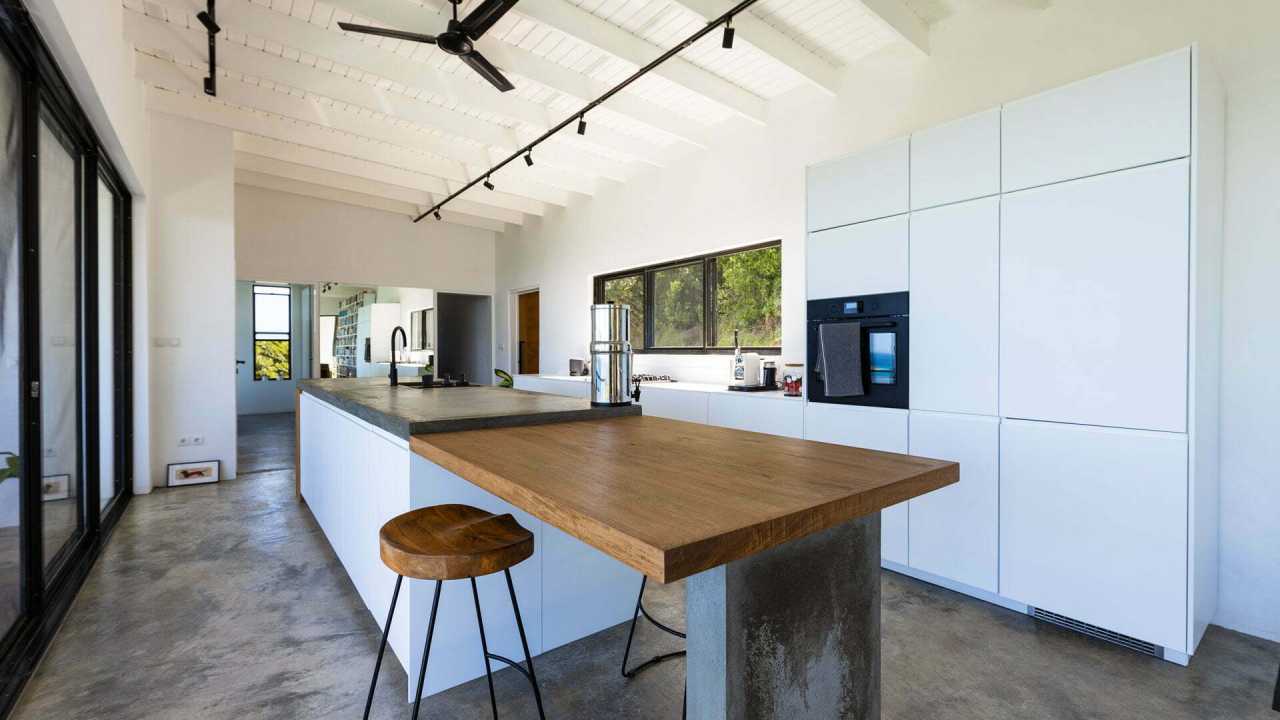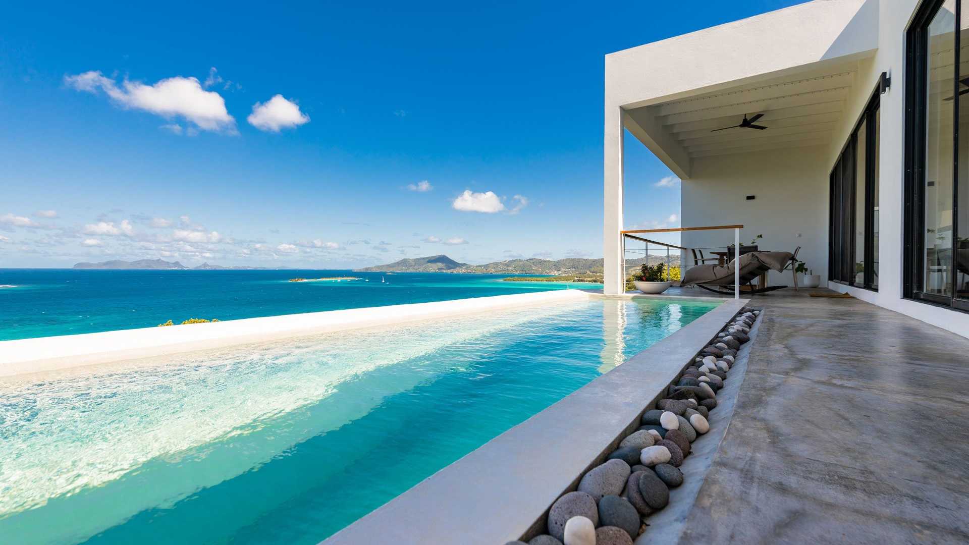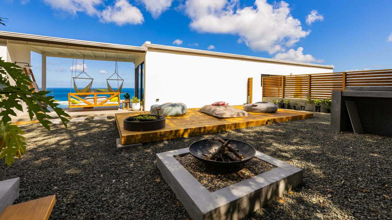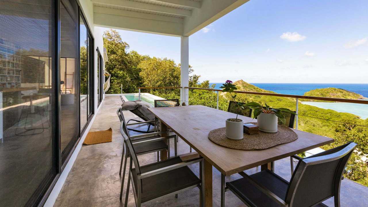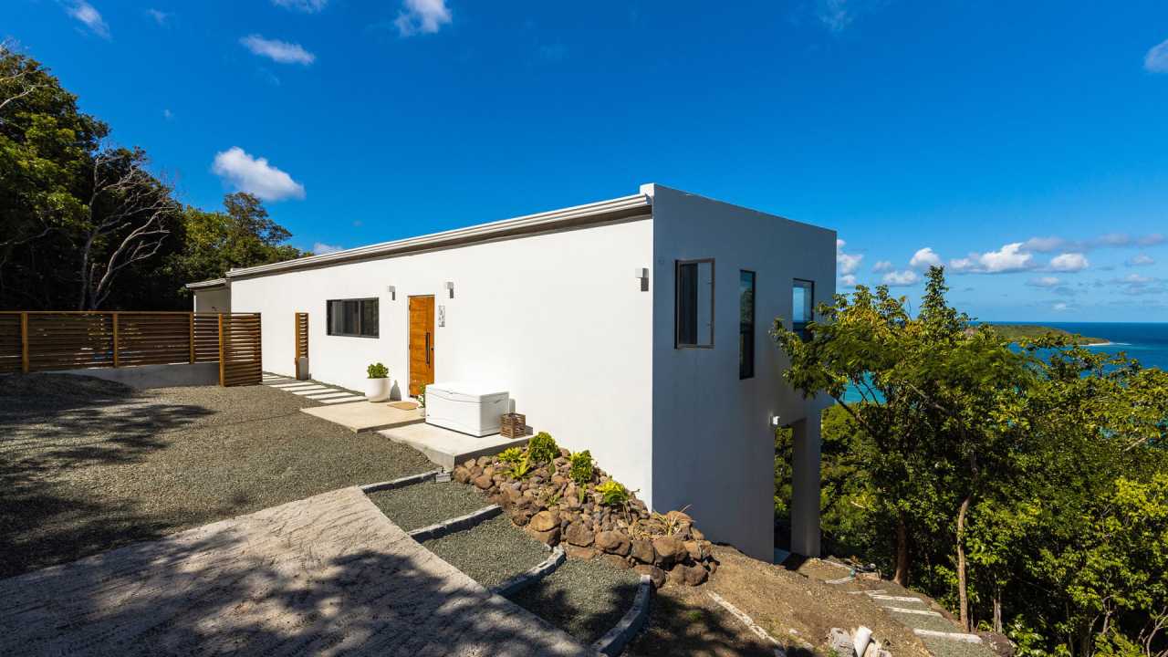 This residence affords expansive ocean views to the picturesque Grenadine islands. Sited at the highest point of a steeply sloped site, the spaces are sequenced in a linear progression that frames the ocean views at the forefront. Along the opposite aspect, a relaxed, uncovered garden area is outfitted with an elevated timber platform and soft furnishings along with cooking facilities that expand the living space to the outdoors.