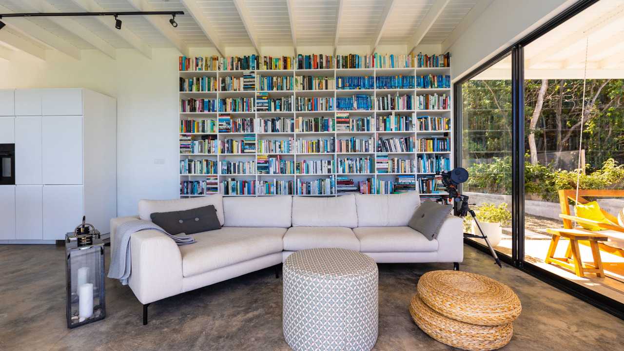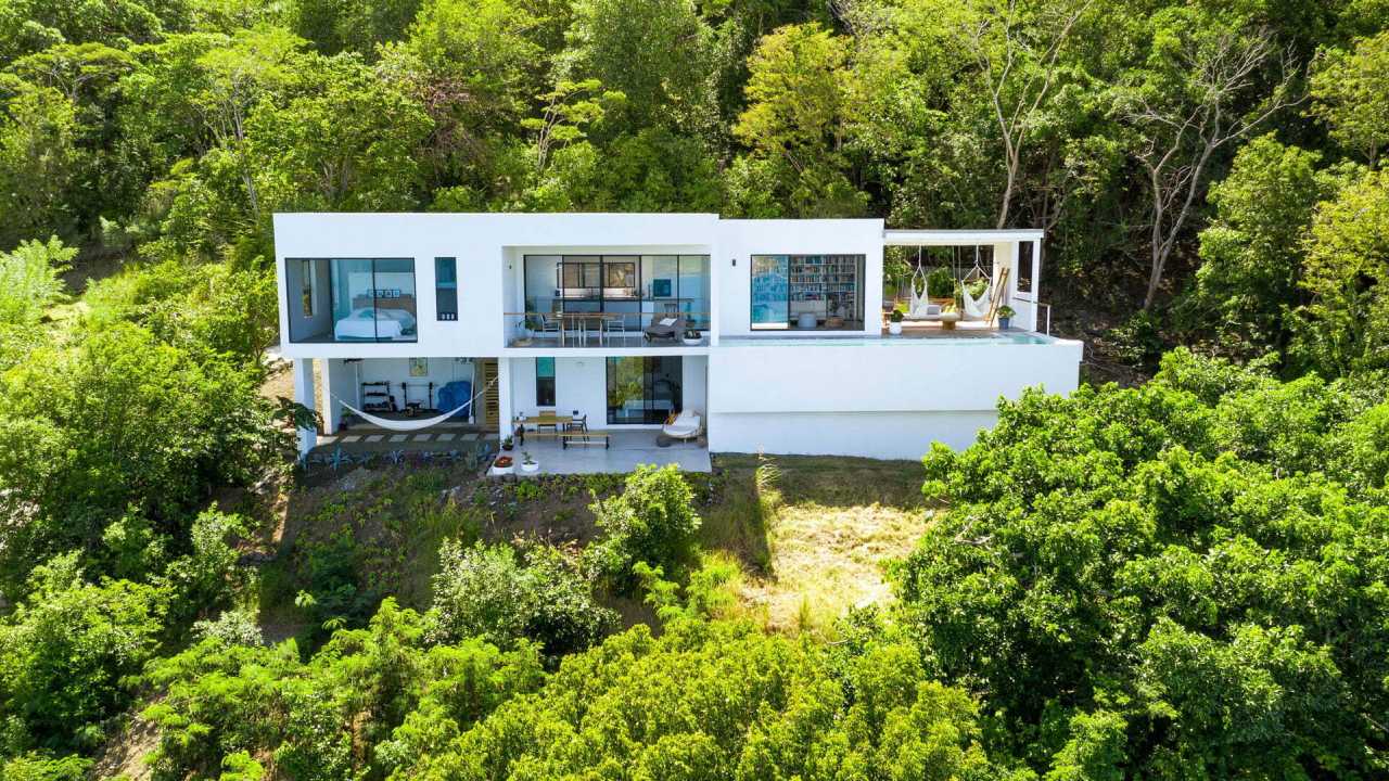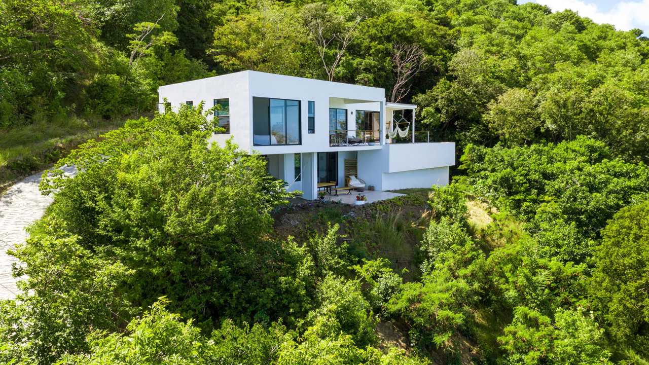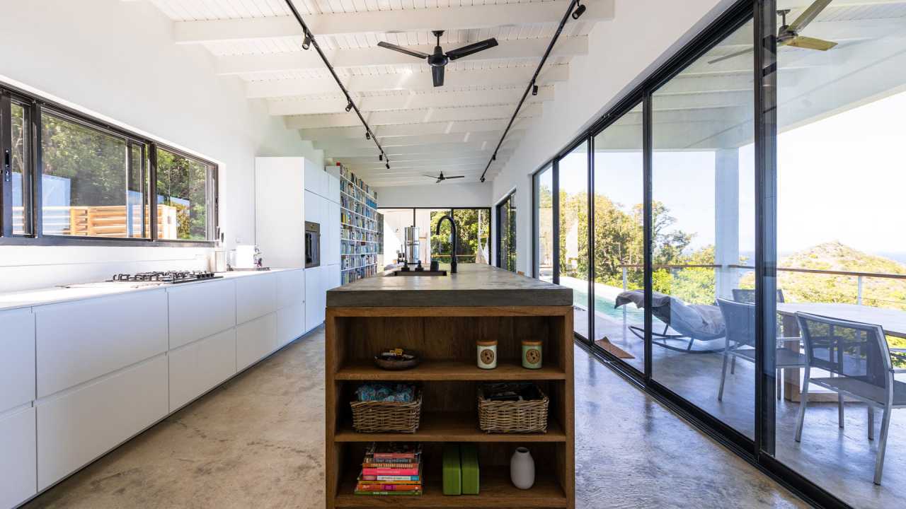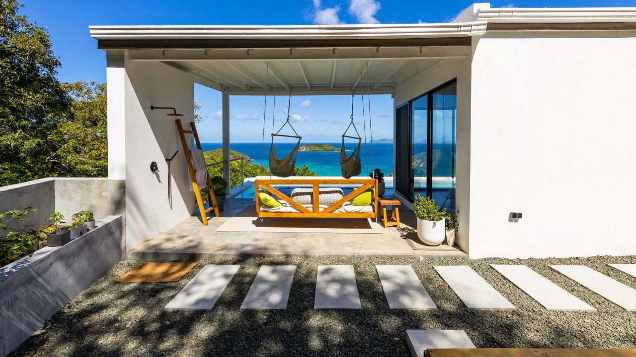 This residence affords expansive ocean views to the picturesque Grenadine islands. Sited at the highest point of a steeply sloped site, the spaces are sequenced in a linear progression that frames the ocean views at the forefront. Along the opposite aspect, a relaxed, uncovered garden area is outfitted with an elevated timber platform and soft furnishings along with cooking facilities that expand the living space to the outdoors.