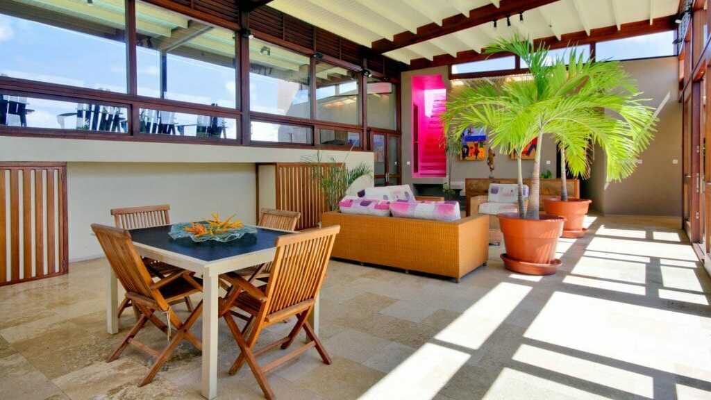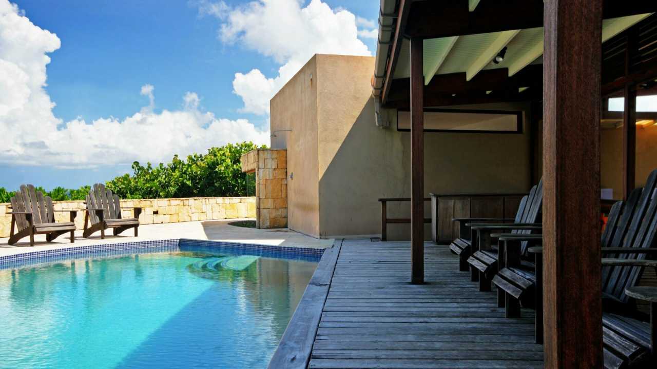 A ‘U’ shaped living space is placed centrally and flanked on one side by four bedrooms with service functions on the opposite side. Coral stone blankets the exposed weather side of the house, combined with robust, exotic timber, travertine and wood floors throughout.