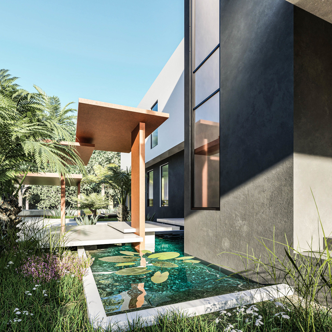 This project was designed to satisfy the client’s programme by maximizing the use to the external areas of the site, while ensuring security of the property in a new gated community of Georgetown Guyana. Originally, the town was built below sea level with canals designed to provide drainage that no longer function as they should. For this reason, it was necessary to raise the site level by three feet to mitigate the danger of flooding.